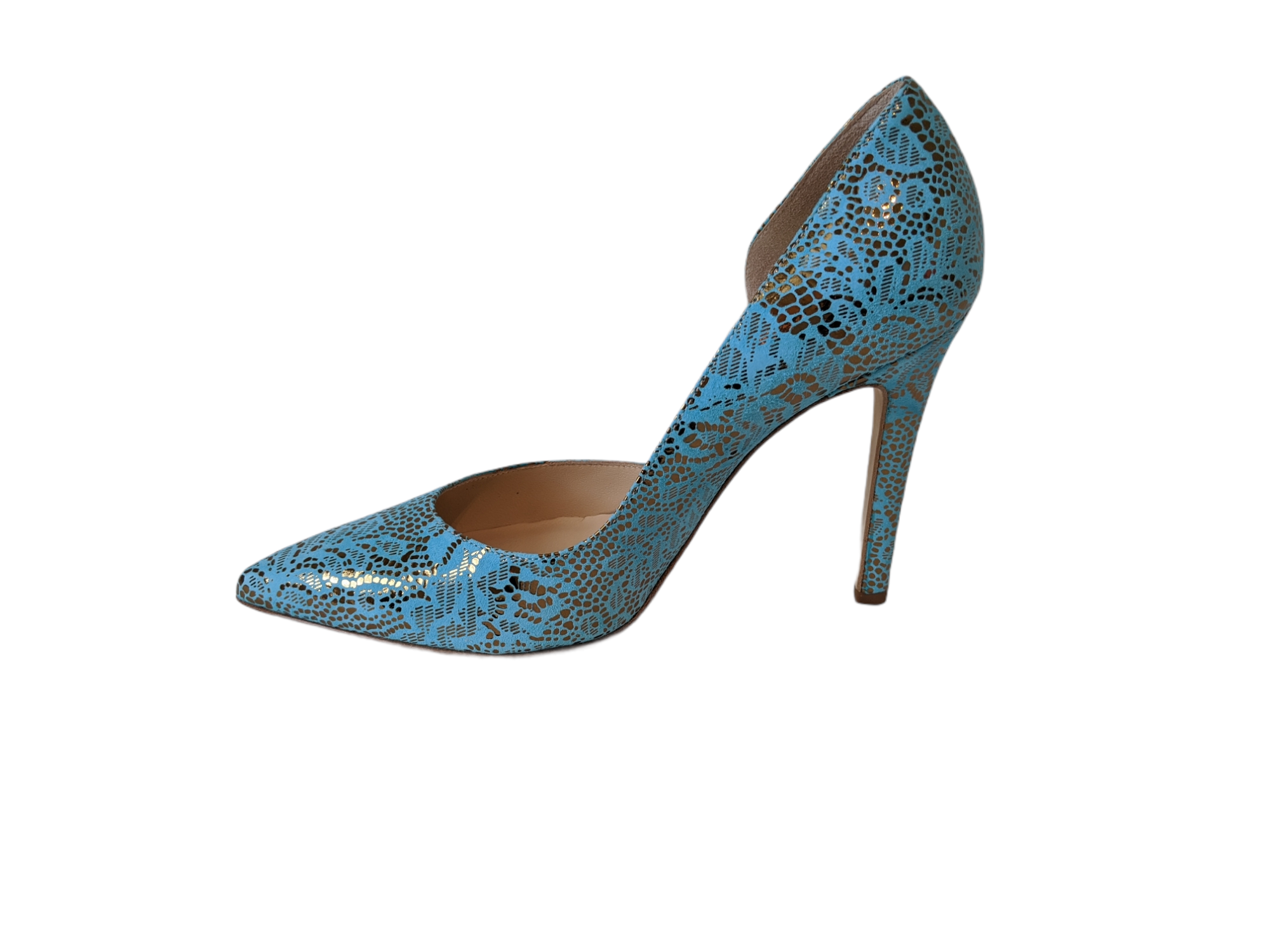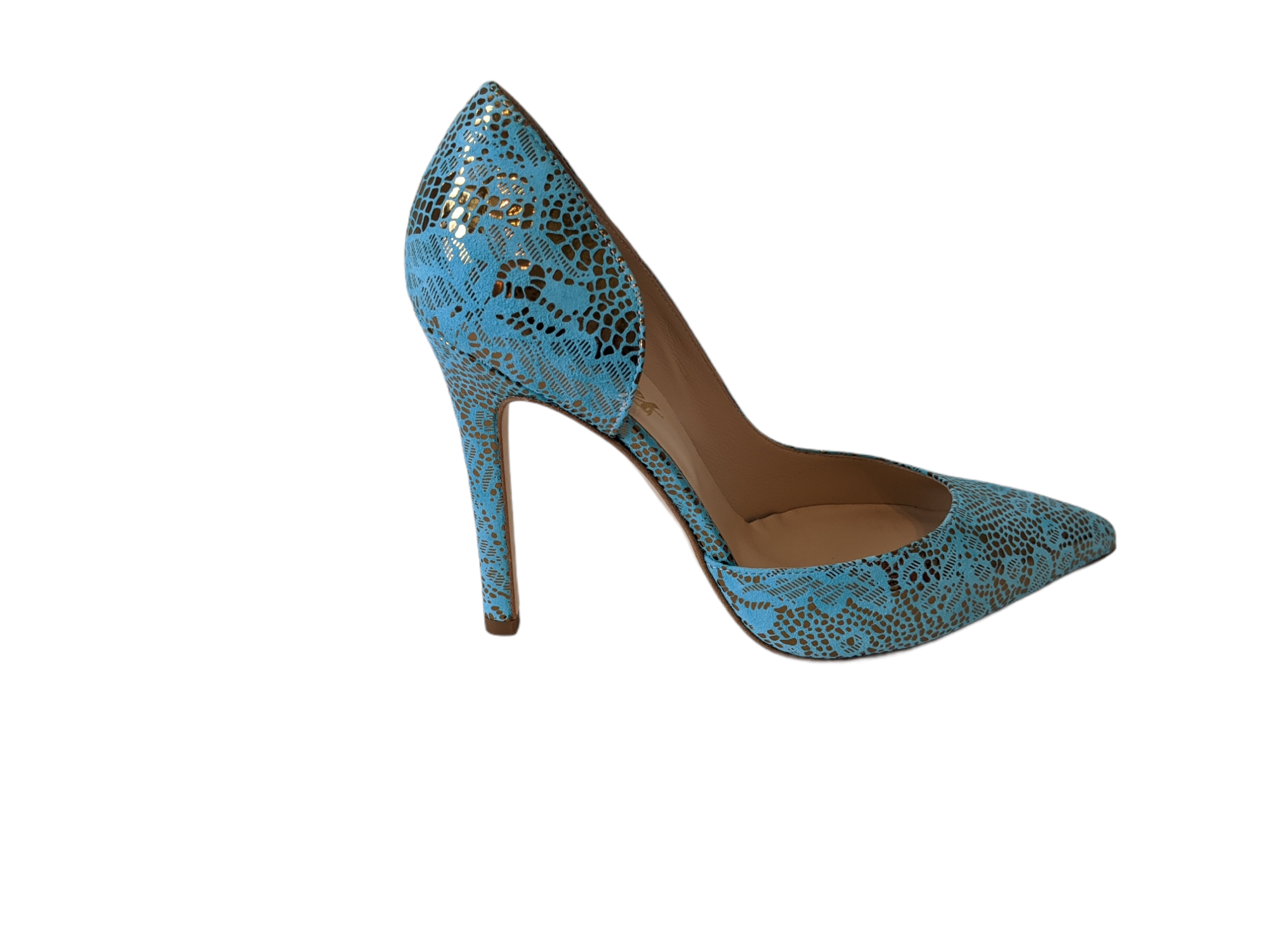 Expertly handmade in Italy, these stunning heels are crafted from premium laser-cut leather, offering a perfect blend of artistry and precision. The signature d’Orsay silhouette—featuring a sleek open side—adds an air of timeless elegance, while the unique Aqua Bronze finish delivers a bold, modern edge.